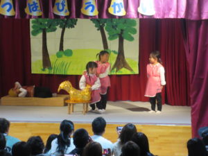 自信満々の子や、緊張している子など様々でしたが、今まで楽しんできた劇あそびを思う存分披露できました。
